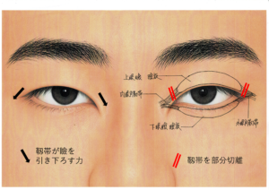 実際には、目頭、目尻の皮膚を小さく切開して、この靱帯を部分的に切り離して、引き下ろす力を緩めます。これはかなり繊細な手術です。